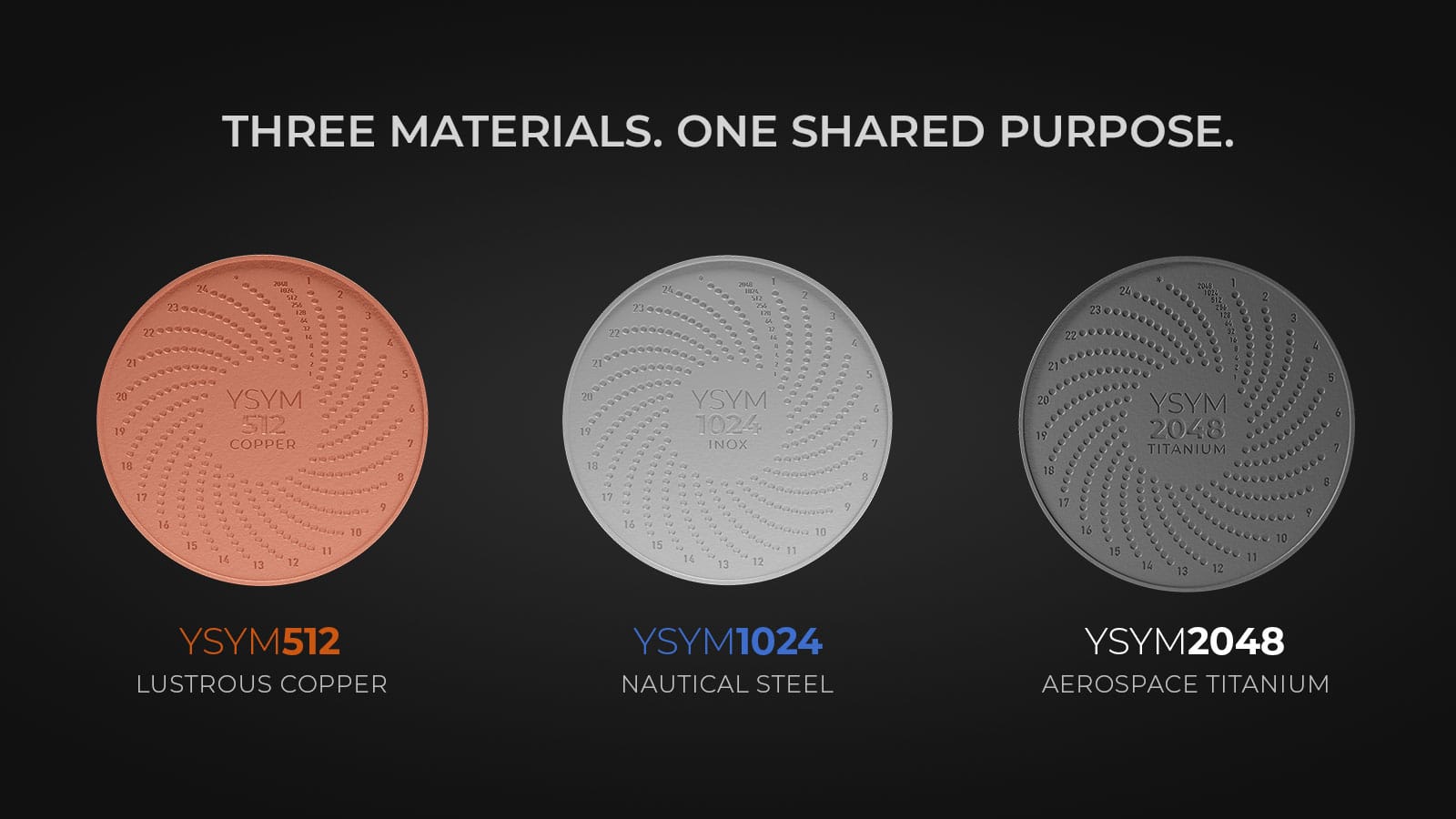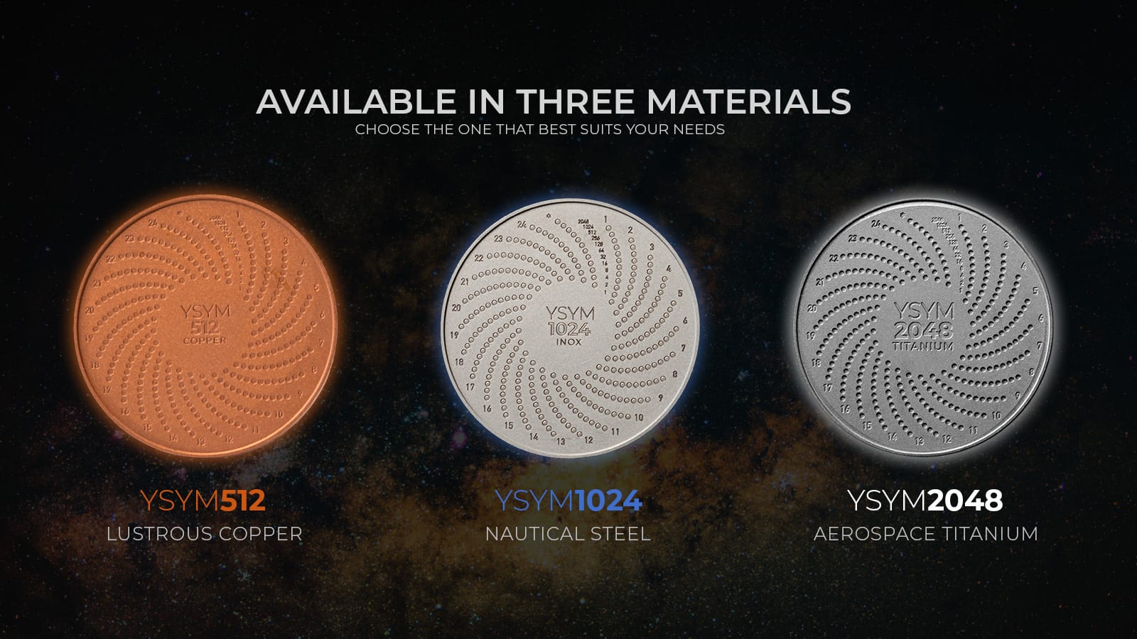 All our models share the same dimensions: 50 mm in diameter and 3 mm thick, as well as encryption and concealment capabilities. The only difference is the material they are made of, and in the case of the YSYM2048, which also includes the Crypto Security Fundamental Course for free.