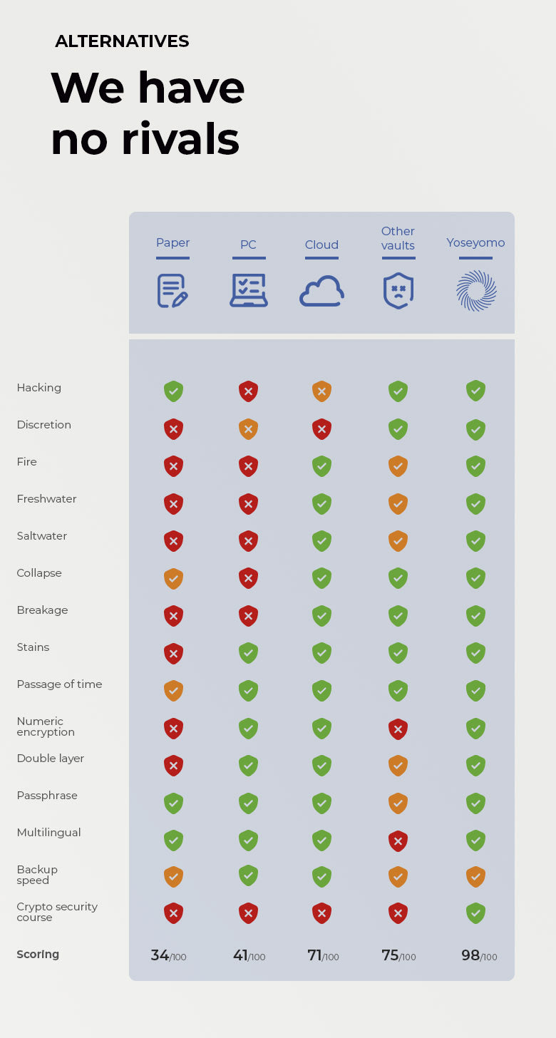 Yoseyomo focuses on security. Our vaults, built with high-strength materials such as nautical steel and grade 5 titanium, are designed to protect your private cryptocurrency keys against any incident.