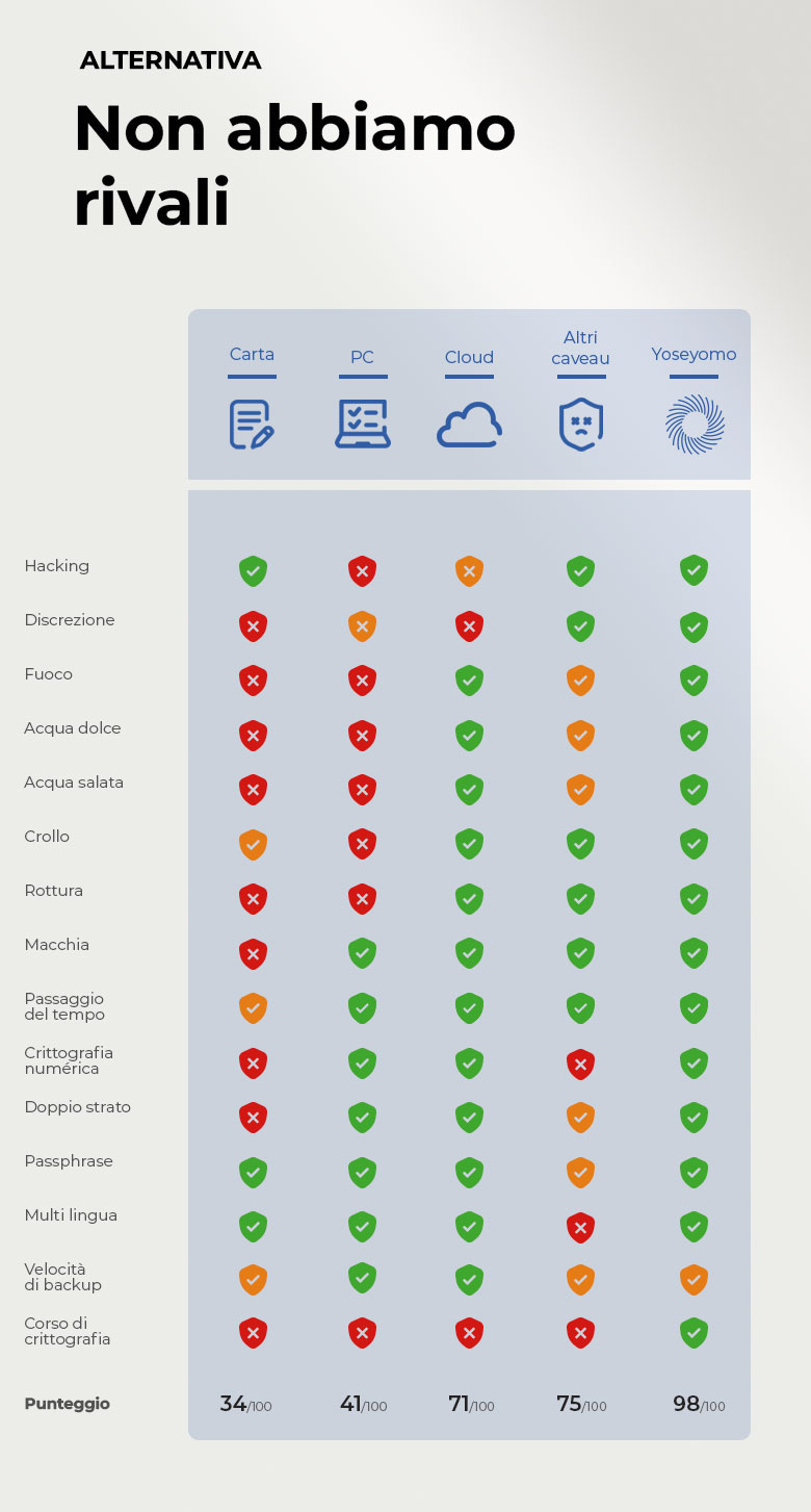 Yoseyomo definisce l'eccellenza nella protezione delle criptovalute. Con materiali all'avanguardia e un design senza precedenti, ogni cassaforte è all'altezza delle sfide più esigenti. L'uso esclusivo di acciaio nautico e titanio di grado 5 ci distingue, garantendo una durata e una sicurezza senza pari. In un mondo dove l'incertezza è la norma, Yoseyomo offre una soluzione di fiducia, progettata per superare qualsiasi ostacolo.