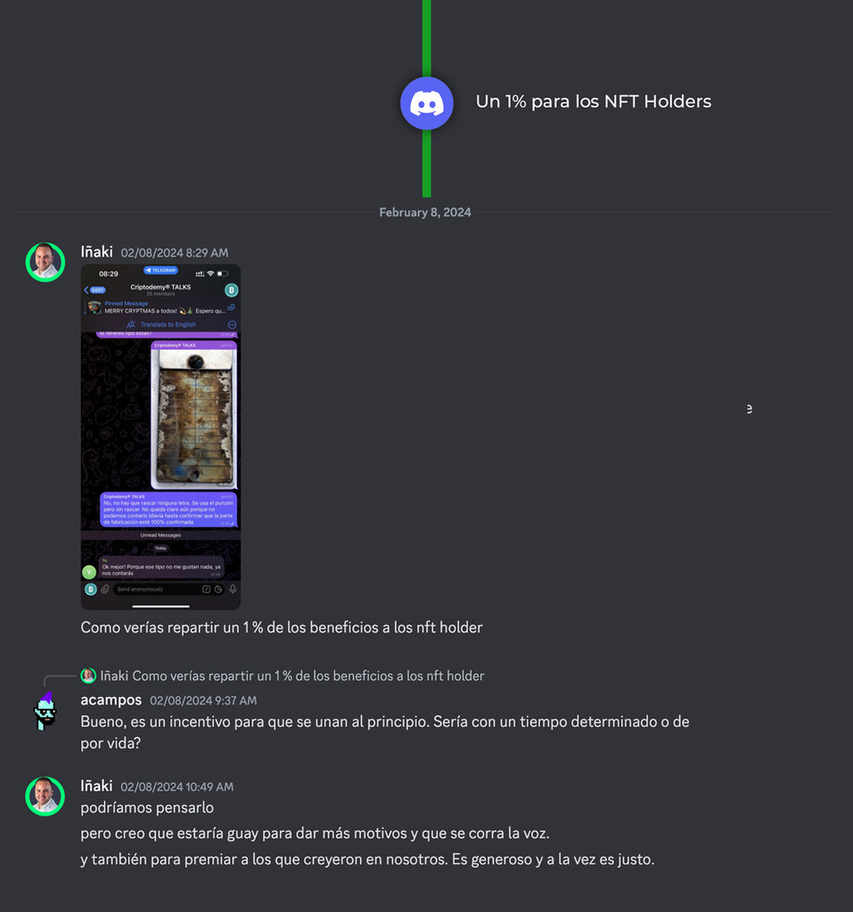 Desde que hemos empezado, todo han sido buenas sensaciones. Nos habéis dado feedback positivo, propuestas, ideas.. la verdad que creemos que vamos por buen camino. Además hoy le he planteado a Álvaro cómo vería repartir un 1% de los beneficios de la empresa anuales, entre todos los NFT Holders. Le parece bien, y faltará ver que con la SL hacer eso tenga encaje legal. Pero nos apetece premiar de alguna forma la confianza de nuestros Crowdfounder.