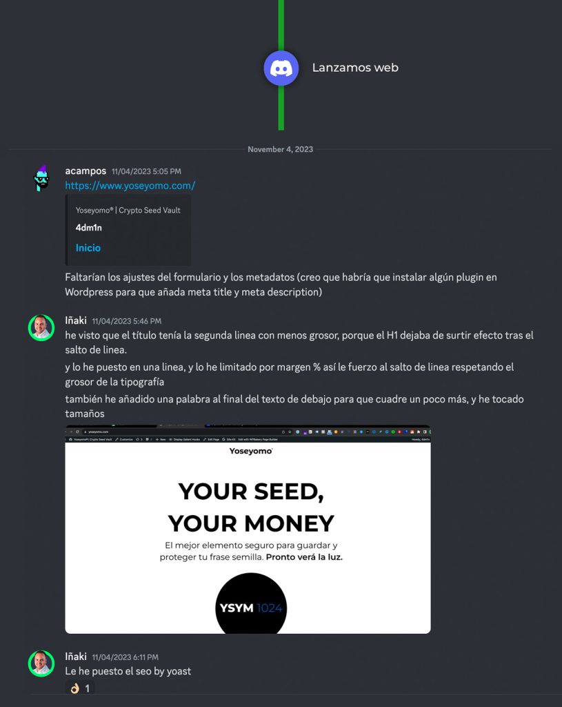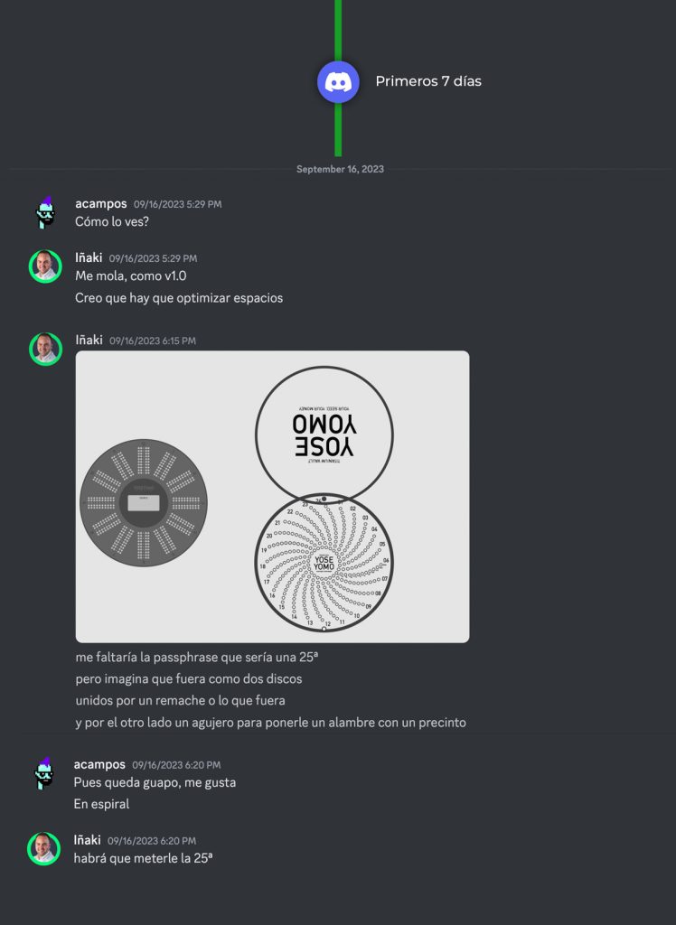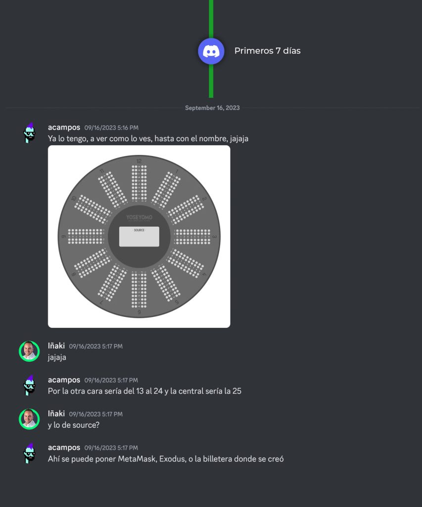 Nosotros (Álvaro e Iñaki) compartimos comunidad en Alex Augusto Trading, un lugar donde, además de aprender trading, se producen muchas sinergias entre sus miembros. Todo comienza hoy, 9 de septiembre de 2023, cuando Álvaro, tras preguntar unas dudas a colación de un video de Iñaki en Criptodemy sobre cómo preservar la seed phrase, etc., de forma bastante abrupta propone “pensar para hacer algo útil y guapo, es buena idea”; parecía que el proyecto era una llamada.