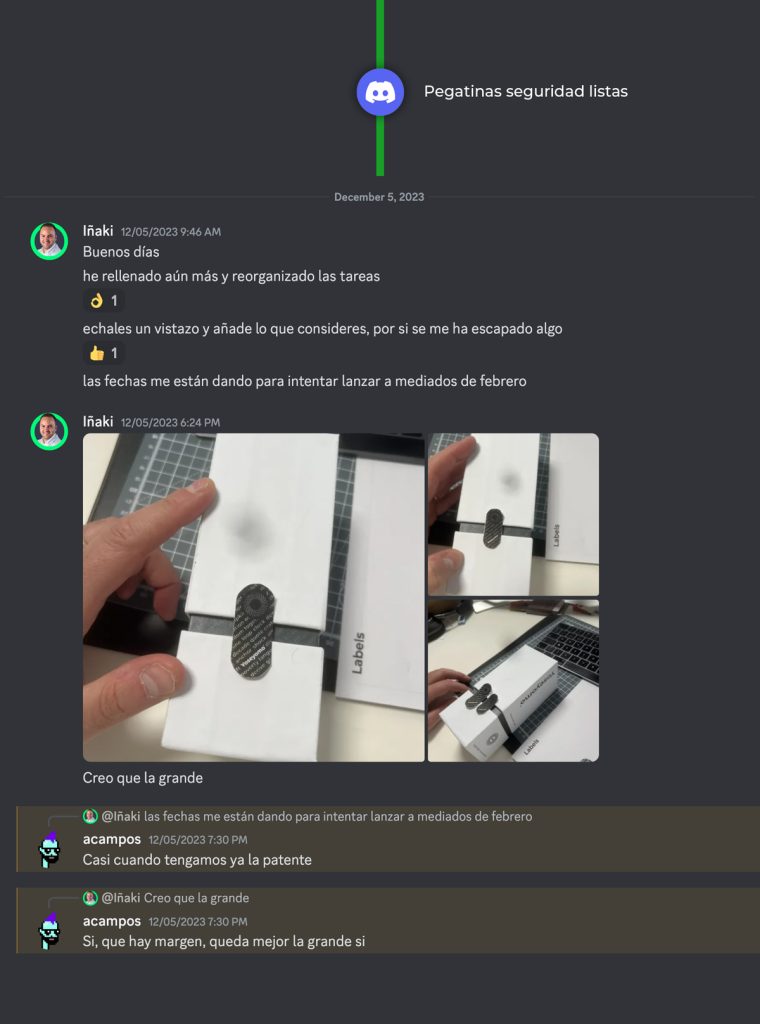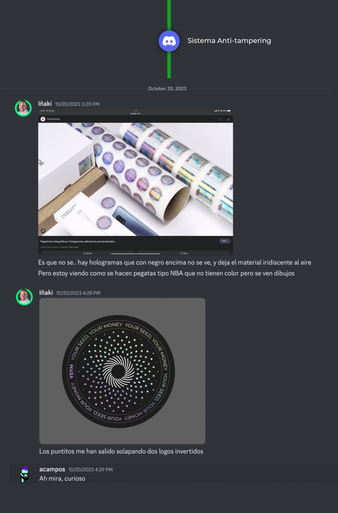 Necesitaremos unos precintos anti-manipulación. Así que hemos diseñado y pedido precios. Queremos que tengan efecto holográfico y que dejen un residuo si alguien intenta levantar el precinto. De esa manera el usuario sabe en todo momento con garantías, si el producto ha sido abierto o las frases semilla expuestas.