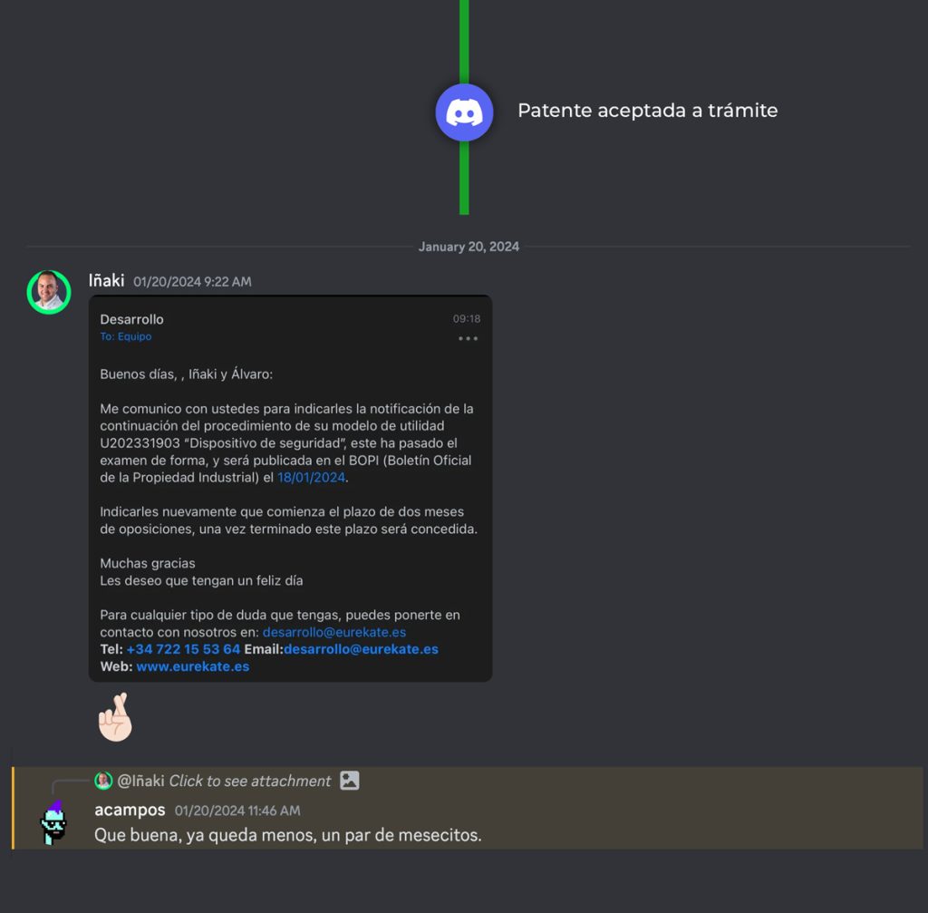 Seguimos avanzando, tenemos muchas cosas aún por delante que debemos ir cerrando y desarrollando. De modo que hoy tramitamos el registro de la marca en la Oficina Española de Patentes y Marcas, y además arrancamos el proceso de registro de Modelo de utilidad con un despacho especializado.